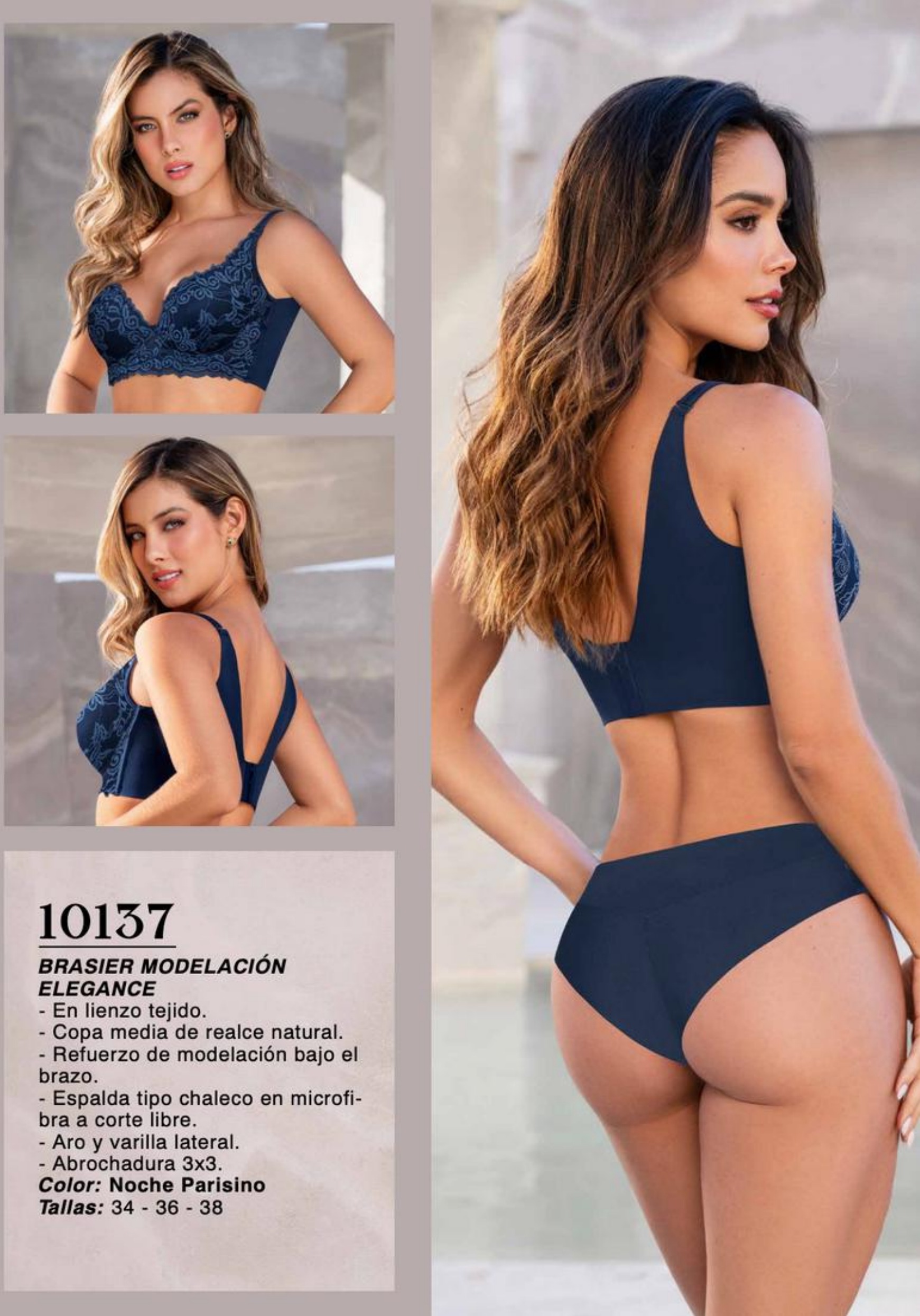 BRASIER MODELACIÓN ELEGANCE – En lienzo tejido. – Copa media de realce natural. – Refuerzo de modelación bajo el brazo. – Espalda tipo chaleco en microfi – bra a corte libre. – Aro y varilla lateral. – Abrochadura 3×3. Color: Noche Parisino Tallas: 34 – 36 – 38